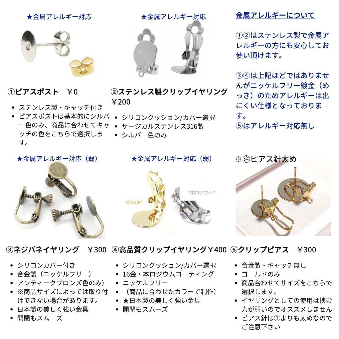 ⑤クリップピアス(合金製・キャッチ不要・ポストを削ればイヤリング兼用ですが挟む力が弱いためイヤリングとしてのご使用はおすすめいたしません。)
