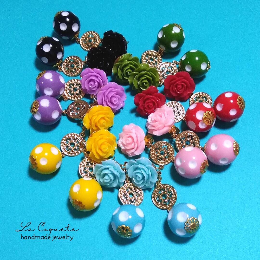 カラフルな大きめの水玉ビーズを使ったフラメンコ感満載のピアス/イヤリングです。