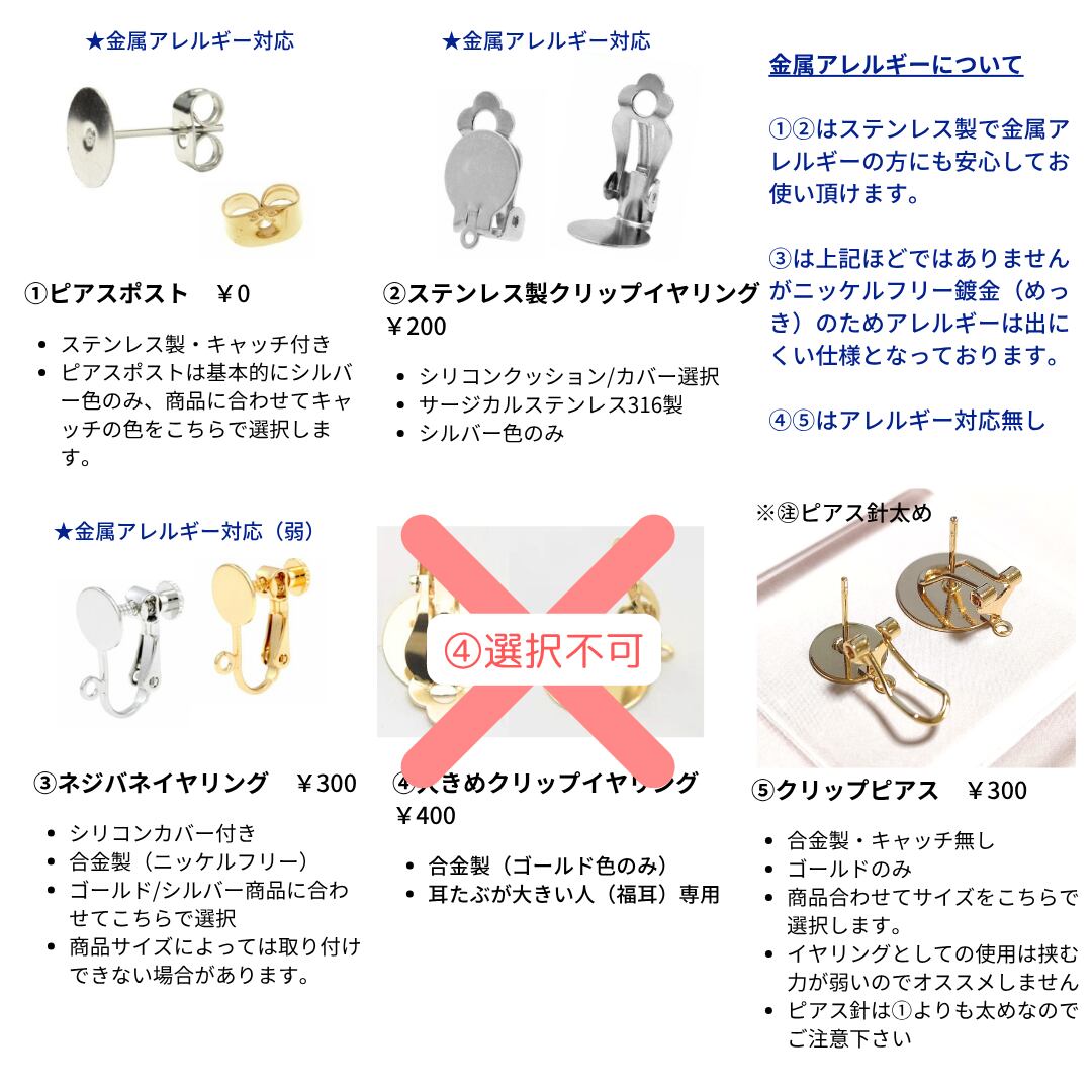 ※⑤クリップピアスはキャッチ不要ですが、下向き防止キャッチをお選び頂いた場合は別途お付けさせて頂きます。
