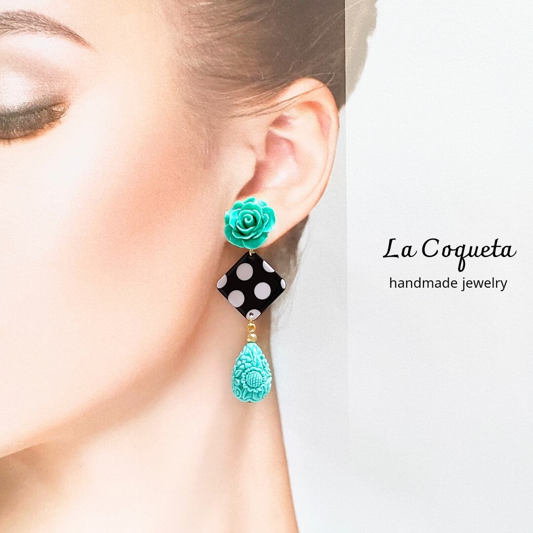 黒白水玉のフラメンコピアス/イヤリング(ターコイズ)